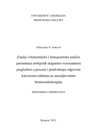 Značaj volumetrijske i histogramske analize parametara dobijenih magnetno-rezonantnim pregledom u proceni i predviđanju odgovora karcinoma rektuma na neoadjuvantnu hemioradioterapiju : doktorska disertacija