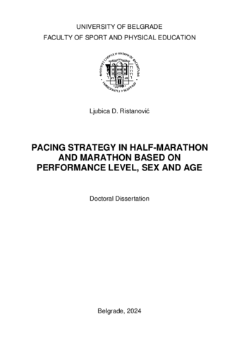 Стратегија темпа (СТ) је кључни фактор који утиче на такмичарску успешност (ТУ) у трчању на дуге дистанце, управљајући интензитетом напора током трке. Циљ овог истраживања је био да анализира и упореди СТ код тркача на полумаратону и маратону, у зависности од нивоа ТУ, пола и старости. Узорак испитаника је чинило 233.083 тркача који су завршили трке у полумаратону (N=150.232) и маратону (N=82.815) у Бечу, од 2006. до 2023. године. За анализу су коришћени званични подаци са интернет странице организатора.СТ је анализирана кроз 5 сегмената обе трке. У полумаратону, стаза је подељена на четири сегмента од 5 км и један од 1.0975 км, док је сваки сегмент у маратону двоструко дужи. Проценат просечне промене брзине сваког сегмента (ППБС1–5) израчунат је у односу на укупну брзину трке. Апсолутна промена брзине целе трке (АПБ) је израчуната као просечна вредност пет ППБС вредности. Групе према ТУ су креиране као квартили на основу пласмана на трци.Позитивна СТ са крајњим убрзањем (КУ) и различитим сегментима примећена је у готово свим подгрупама тркача, без обзира на врсту трке, ТУ, пол и старост. Бржи тркачи су показали равномернију СТ у поређењу са споријим тркачима. Спорији тркачи су имали израженије КУ у поређењу с бржим тркачима. Примећена је значајна разлика у АПБ између трка унутар сваке групе ТУ.Мушкарци су имали нижи АПБ од жена у полумаратону, док је супротан тренд примећен у маратону. Разлике између полова су биле израженије у маратону у поређењу са полумаратоном. Жене су имале веће КУ у односу на мушкарце.Мушкарци старости од 40 до 59 година и жене старости од 40 до 49 година су имали равномернију СТ у поређењу с млађим и старијим тркачима у полумаратону. У маратону су тркачи старости од 30 до 49 година имали равномернију СТ без обзира на пол. Код мушкараца је равномернији темпо примећен унутар сваке старосне категорије у полумаратону у поређењу са маратоном, док код жена није било значајне разлике. Најмлађи тркачи су имали најизраженије КУ код оба пола у полумаратону. У маратону, најмлађи мушкарци су имали најизраженије КУ, док су и најстарије и најмлађе жене имале најизраженије КУ.